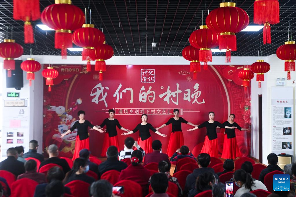 Actresses dance during a performance at an auditorium in Shijiaqiao Village of Wuxing District in Huzhou, east China's Zhejiang Province, Jan. 11, 2023. The performance was held to greet the upcoming Spring Festival. (Xinhua/Xu Yu)