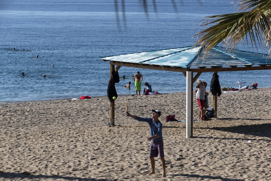 People spend time at a beach in Faliro, a southern suburb of Athens, Greece, on Jan. 6, 2023. Greece has been experiencing unseasonably warm temperatures this winter, prompting people to head for the beach instead of the ski resorts. (Xinhua/Marios Lolos)