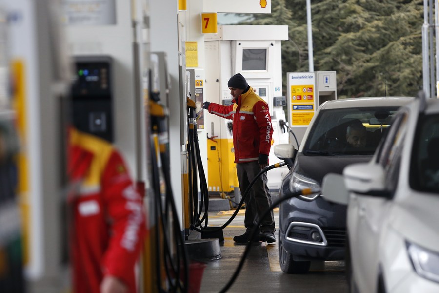 A staff member refuels a vehicle at a gas station in Ankara, Türkiye, on Jan. 11, 2023. (Photo by Mustafa Kaya/Xinhua)