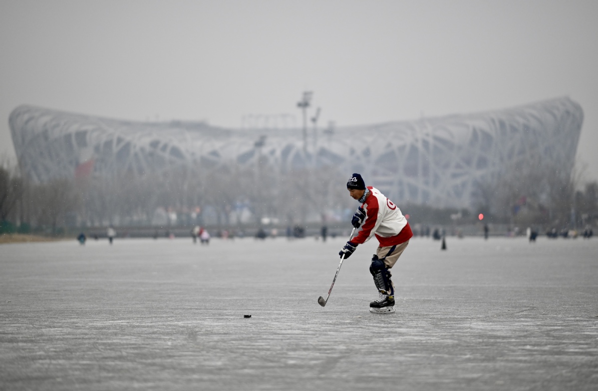 A citizen plays ice hockey in the snow near the National Olympic Stadium in Beijing on Jan 12, 2023. [Photo by Wei Xiaohao/chinadaily.com.cn]