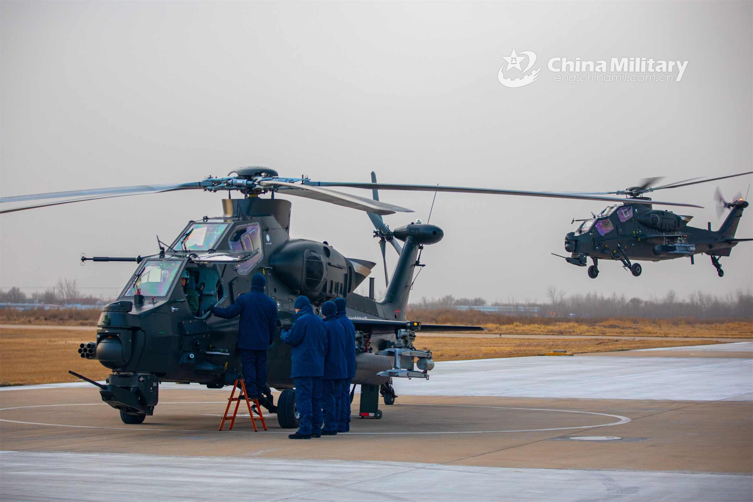 Several ground crew members assigned to an army aviation brigade under the PLA 80th Group Army make pre-flight preparations in a round-the-clock flight training exercise in mid-December, 2022. (eng.chinamil.com.cn/Photo by Liu Yuchen)