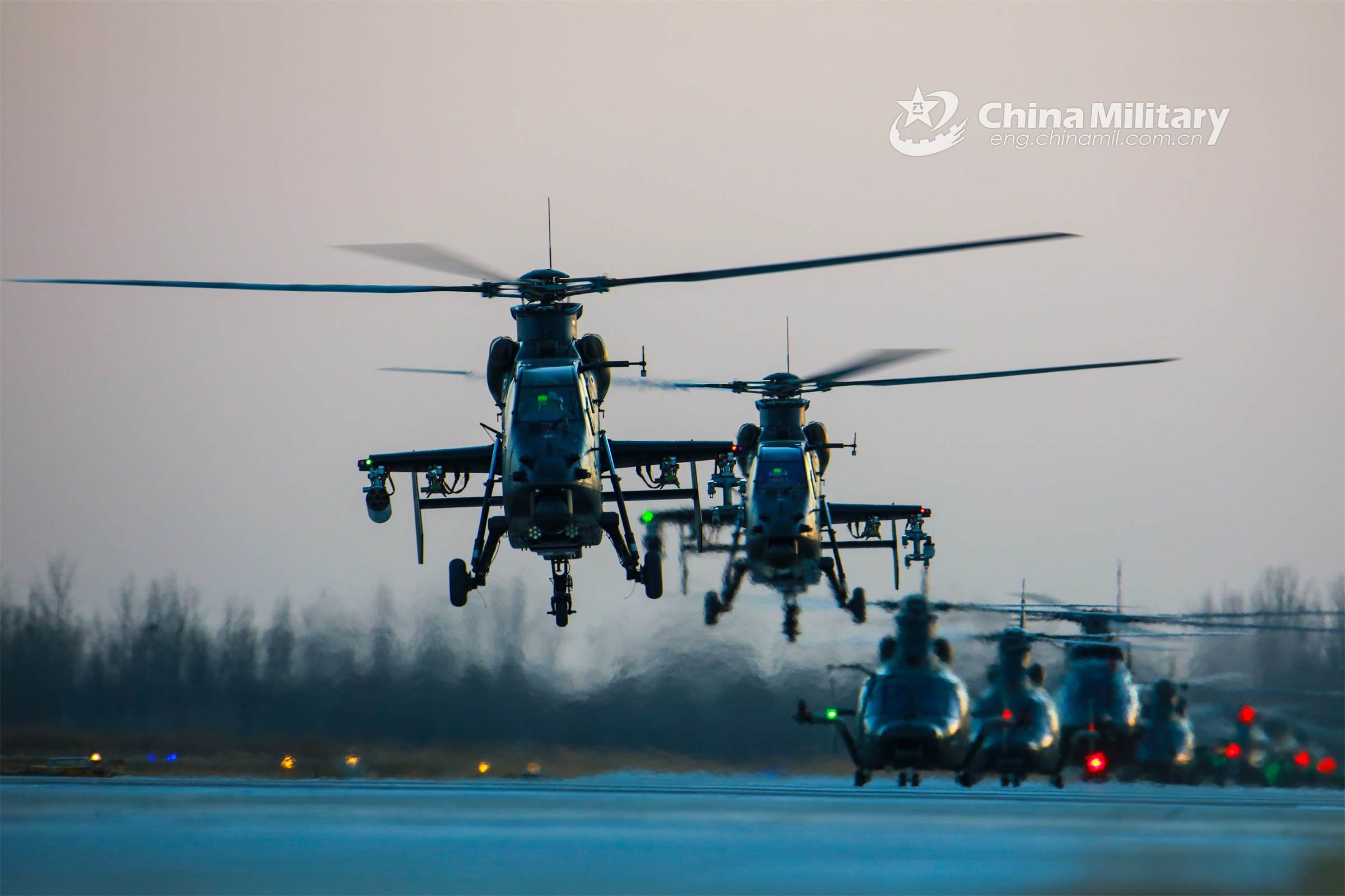 Helicopters attached to an army aviation brigade under the PLA 80th Group Army hover for next maneuver in a round-the-clock flight training exercise in mid-December, 2022. (eng.chinamil.com.cn/Photo by Liu Yuchen)