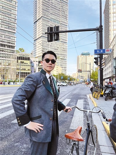 Zhengyi, the initiator of Suit Ride in Shanghai, poses in the clothes he carefully prepared for the ride (Photo/Beijing Youth Daily)