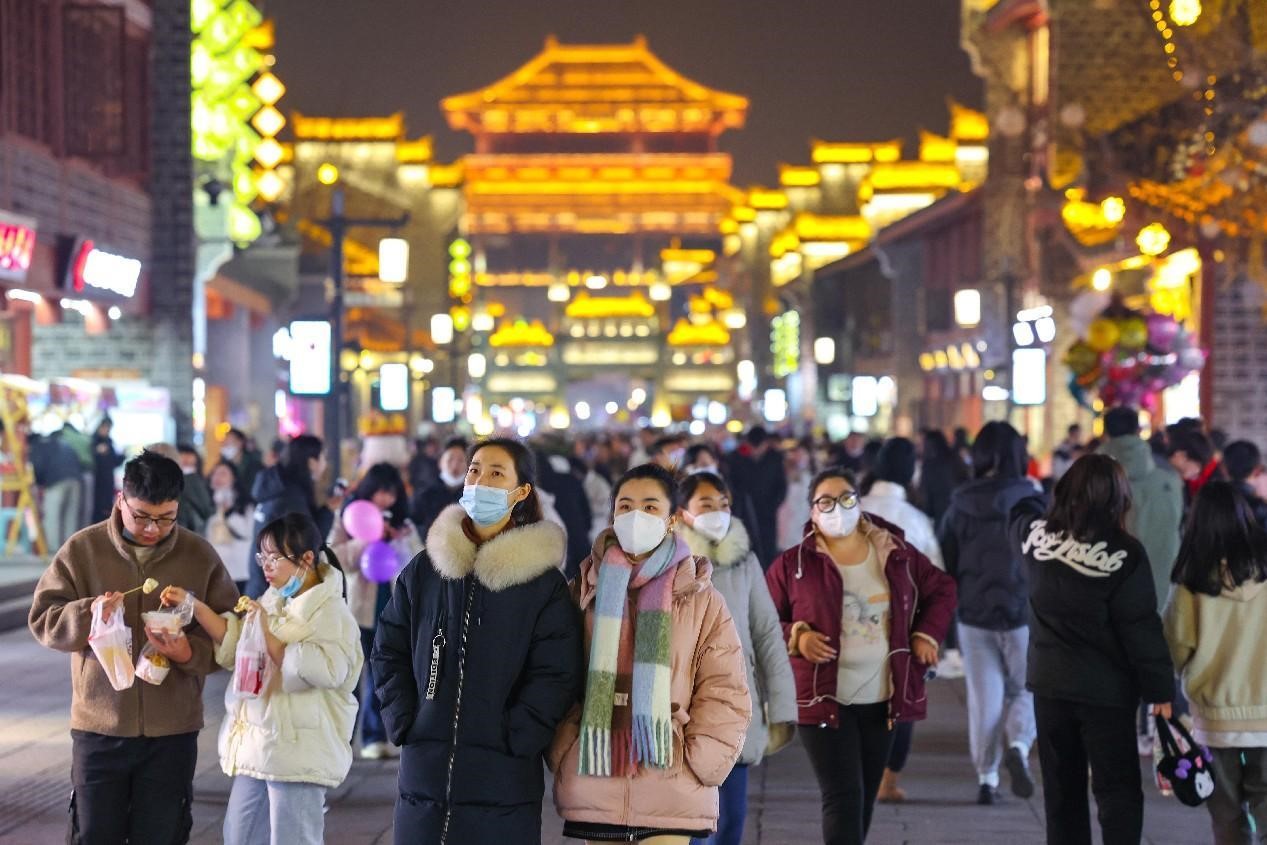 The Bund in Shanghai was crowded with people on New Year's Eve; the SKP shopping mall in Chengdu, capital of southwest China's Sichuan province, saw a long line on the first day of its soft opening; and the most popular shopping district in Changsha, capital of central China's Hunan province, is jam-packed with visitors.