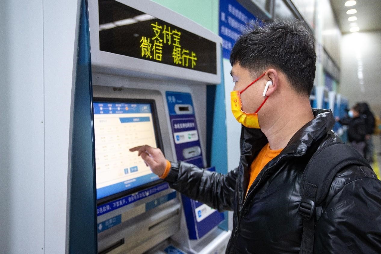 A passenger uses a ticket vending machine to buy a ticket at Nanjing Railway Station in Nanjing, east China's Jiangsu province, Dec. 24, 2022. (People's Daily Online/Su Yang)