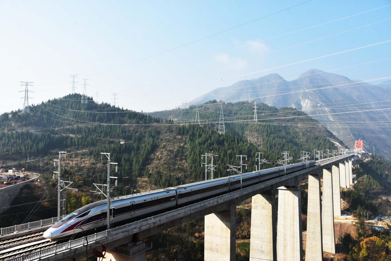 A bullet train runs on a railway bridge over the Daning River in Wushan county, southwest China's Chongqing municipality, Jan. 7, 2023. The railway bridge is a section of the Zhengzhou-Chongqing high-speed railway. (People's Daily Online/Wang Zhonghu)