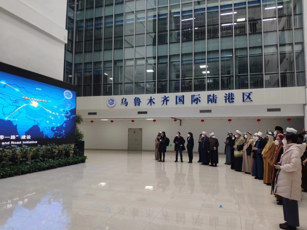 A delegation of world-renowned Islamic figures and scholars learn about the construction of the Belt and Road Initiative at the Urumqi International Land Port Area in Urumqi, capital of northwest China's Xinjiang Uygur autonomous region. (Photo/Xinjiang Daily)