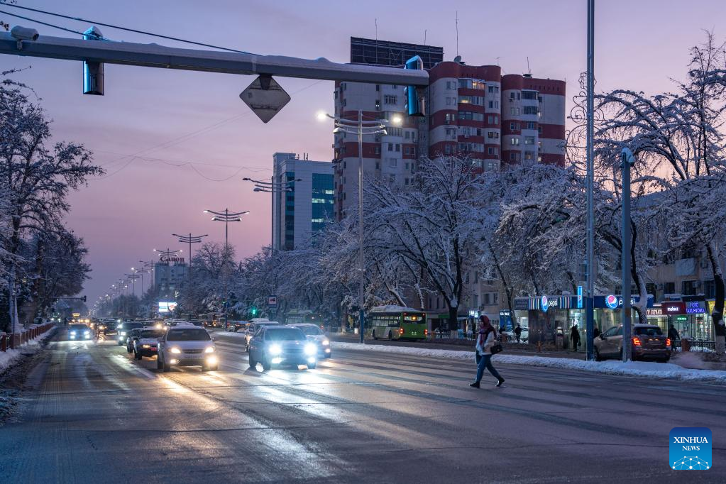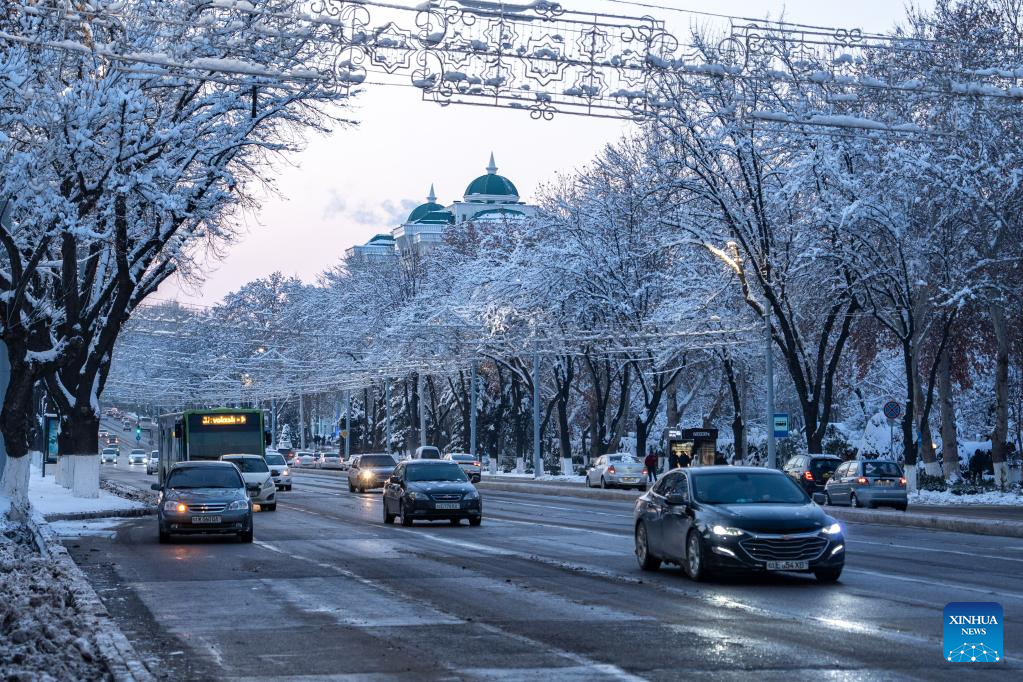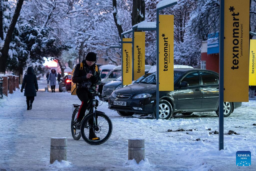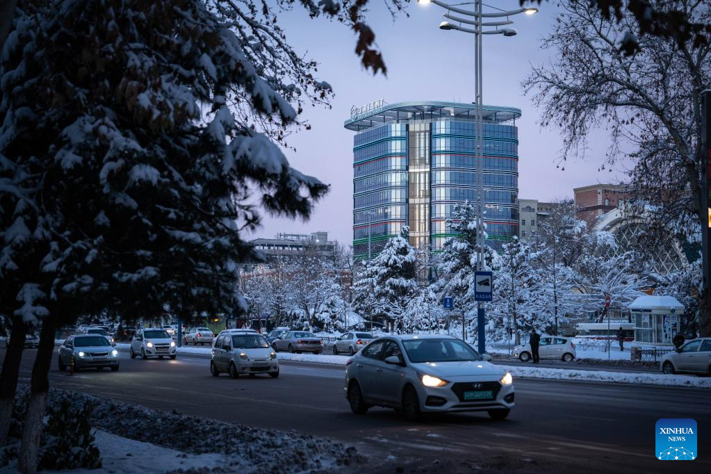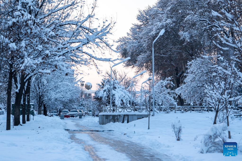 This photo taken on Jan. 12, 2023 shows the snow scenery in Tashkent, capital of Uzbekistan. (Photo by Georgy Namazov/Xinhua)