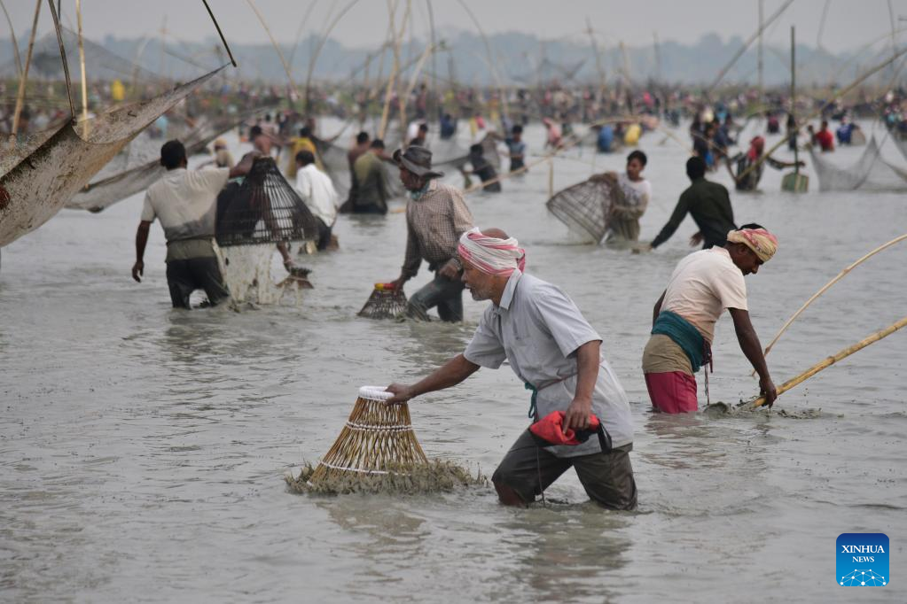 People participate in community fishing during Bhogali Bihu, a festival marking the end of the winter harvesting season, in Nagaon district, Assam state, India, on Jan. 13, 2023. (Str/Xinhua)