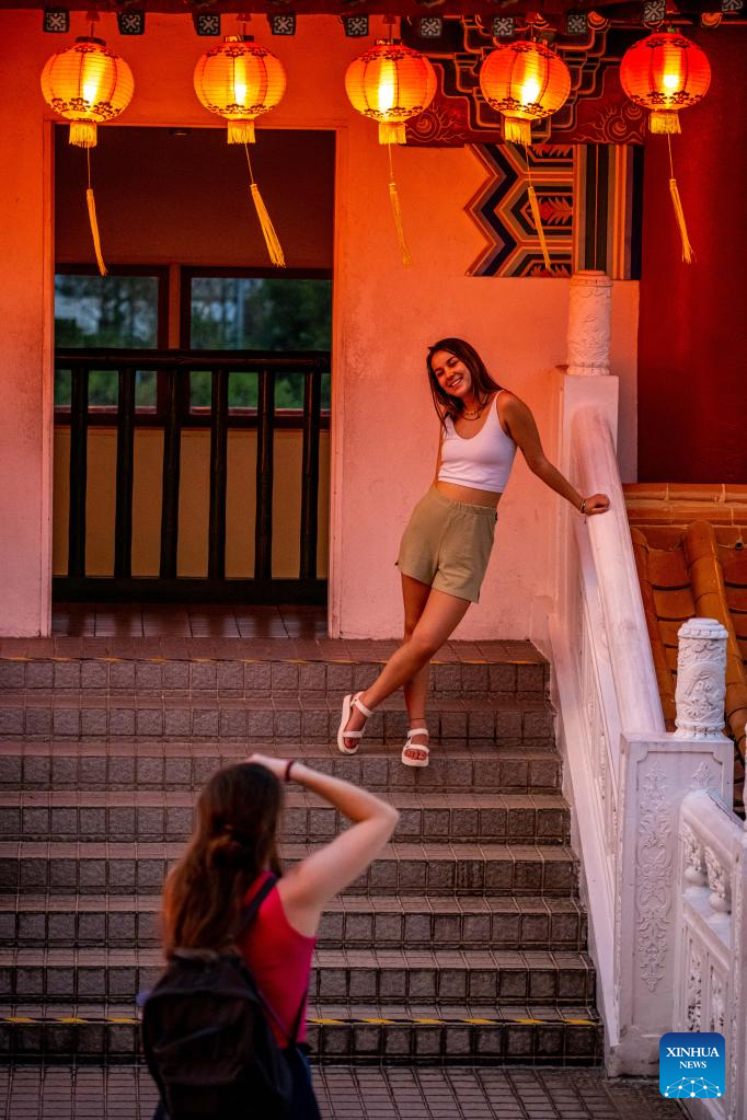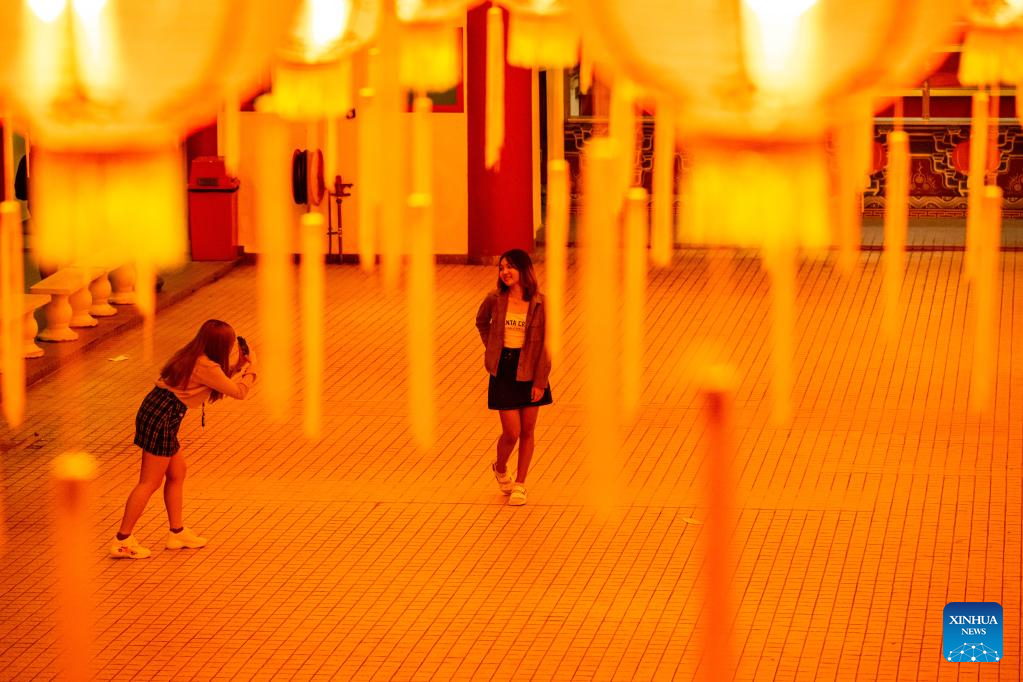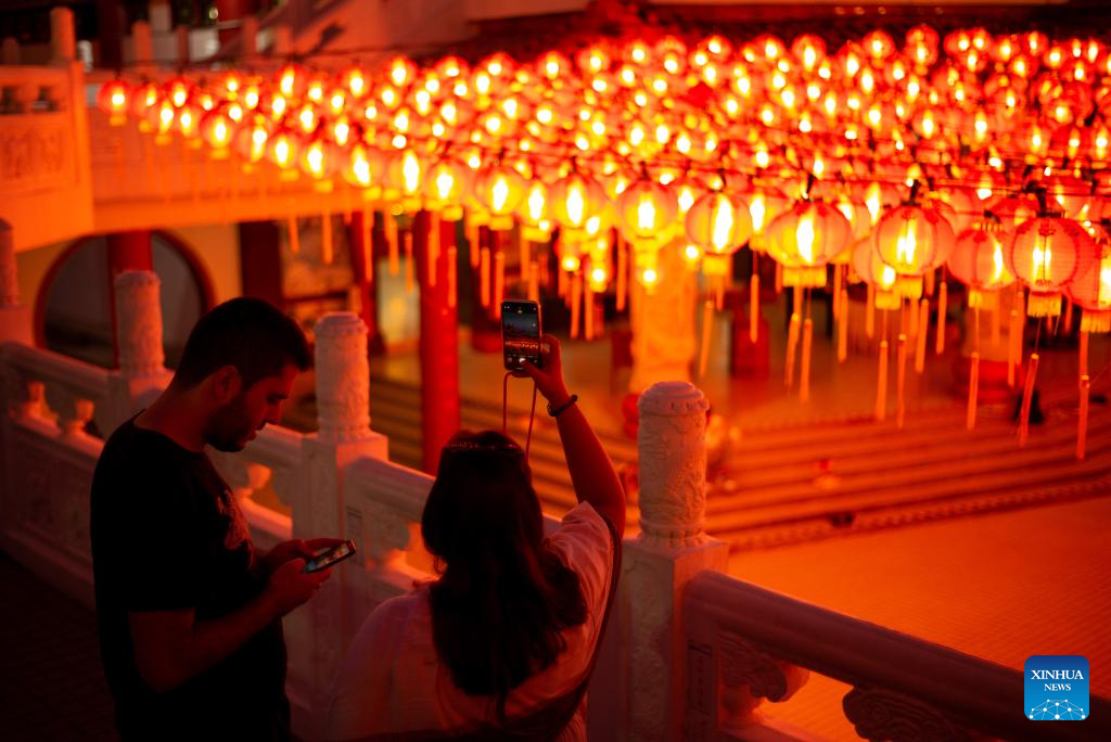 Visitors take photos of red lanterns set for the upcoming Chinese Lunar New Year at Thean Hou Temple in Kuala Lumpur, Malaysia, Jan. 13, 2023. (Xinhua/Zhu Wei)