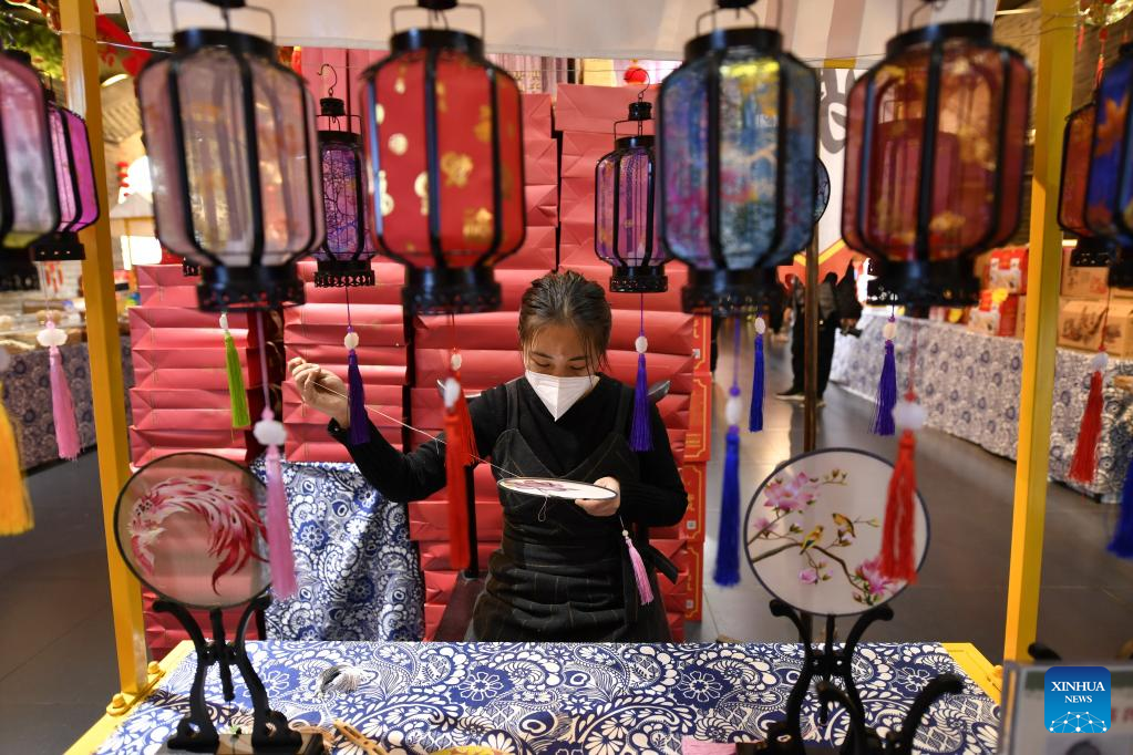 An artist demonstrates embroidery skills at a Spring Festival fair in Fengrun District of Tangshan, north China's Hebei Province, Jan. 12, 2023.