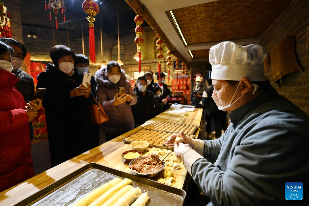 A Spring Festival fair themed on intangible cultural heritage was held in Fengrun District of Tangshan, selling chess-shaped sesame seed cakes, sesame seed candies and other traditional foods. Intangible cultural heritages including Pingju Opera, paper cutting, and calabash pyrography were also presented at the fair. (Xinhua/Mu Yu)