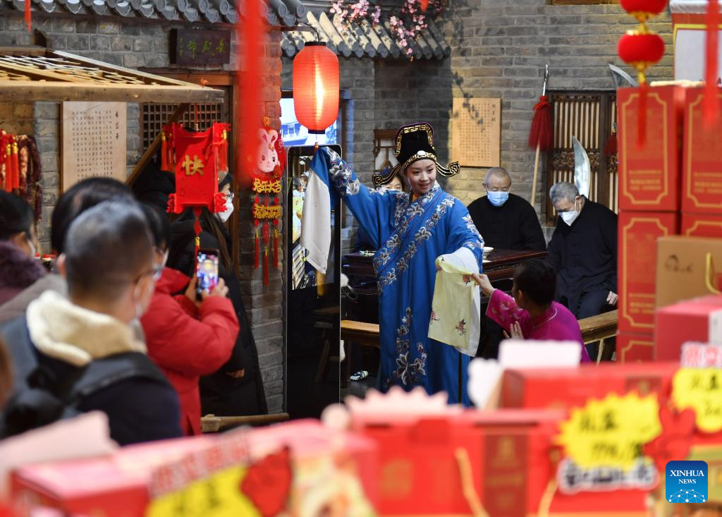 A Pingju opera enthusiast performs at a Spring Festival fair in Fengrun District of Tangshan, north China's Hebei Province, Jan. 12, 2023.