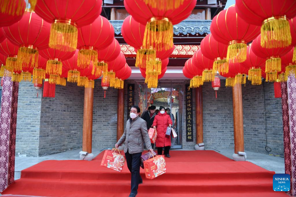 Customers walk out of a Spring Festival fair in Fengrun District of Tangshan, north China's Hebei Province, Jan. 12, 2023.