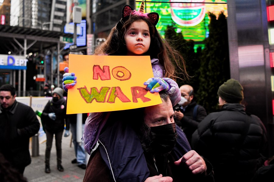 A child holds an anti-war sign during a rally at Times Square in New York, the United States, Jan. 14, 2023.(Photo by Ziyu Julian Zhu/Xinhua)