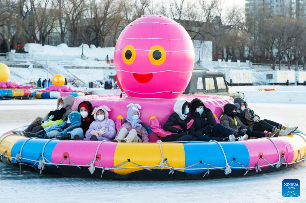 People have fun at the Ice and Snow Carnival park on the Songhua River in Harbin, northeast China's Heilongjiang Province, Jan. 14, 2023. Harbin is famous for its rich ice and snow resources. This winter, the city opened three ice and snow-themed parks, launched 12 ice and snow experience products and 10 such tourism routes, and created more than 100 related activities to promote the development of winter tourism, culture, fashion and sports. (Xinhua/Xie Jianfei)