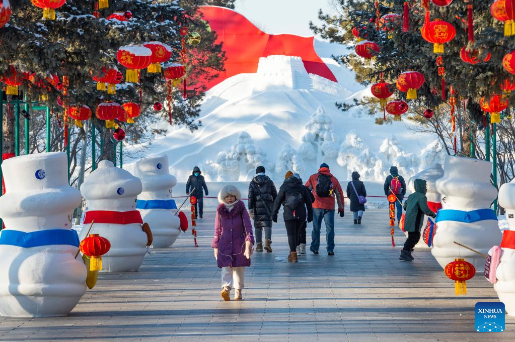 People visit the Taiyangdao Island International Snow Sculpture Expo in Harbin, northeast China's Heilongjiang Province, Jan. 3, 2023. Harbin is famous for its rich ice and snow resources. This winter, the city opened three ice and snow-themed parks, launched 12 ice and snow experience products and 10 such tourism routes, and created more than 100 related activities to promote the development of winter tourism, culture, fashion and sports. (Xinhua/Xie Jianfei)