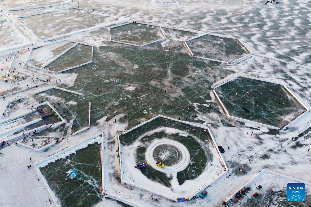 This aerial photo taken on Jan. 14, 2023 shows tourists playing at the Ice and Snow Carnival park on the Songhua River in Harbin, northeast China's Heilongjiang Province. Harbin is famous for its rich ice and snow resources. This winter, the city opened three ice and snow-themed parks, launched 12 ice and snow experience products and 10 such tourism routes, and created more than 100 related activities to promote the development of winter tourism, culture, fashion and sports. (Xinhua/Xie Jianfei)