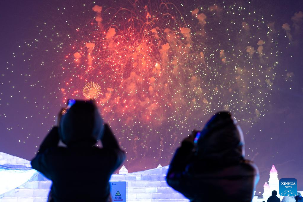 People watch a fireworks show in the Harbin Ice-Snow World theme park in Harbin, northeast China's Heilongjiang Province, Jan. 5, 2023. Harbin is famous for its rich ice and snow resources. This winter, the city opened three ice and snow-themed parks, launched 12 ice and snow experience products and 10 such tourism routes, and created more than 100 related activities to promote the development of winter tourism, culture, fashion and sports. (Xinhua/Xie Jianfei)