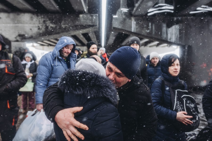 People bid goodbye to each other with a hug in Irpin, Ukraine, March 8, 2022. (Photo by Diego Herrera/Xinhua)