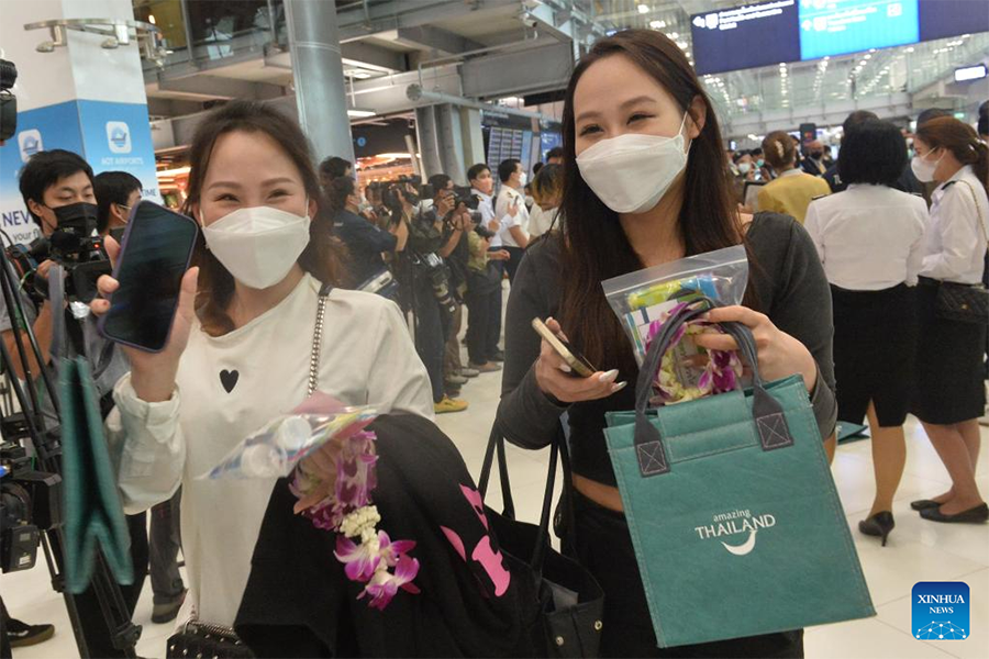 Chinese passengers arrive at the Suvarnabhumi Airport in Samut Prakan, Thailand, Jan. 9, 2022. (Xinhua/Rachen Sageamsak)