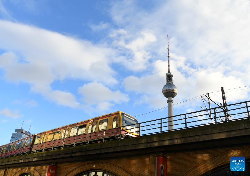 A train runs past the TV Tower in Berlin, Germany, Jan. 13, 2023. Germany's price-adjusted gross domestic product (GDP) in 2022 was 1.9 percent higher than in the previous year, according to preliminary figures published by the Federal Statistical Office (Destatis) on Friday. (Xinhua/Ren Pengfei)