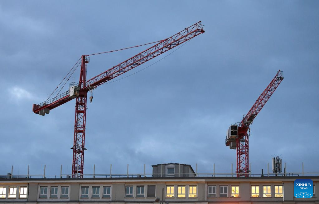 This photo taken on Jan. 13, 2023 shows tower cranes at a construction site in Berlin, Germany. Germany's price-adjusted gross domestic product (GDP) in 2022 was 1.9 percent higher than in the previous year, according to preliminary figures published by the Federal Statistical Office (Destatis) on Friday. (Xinhua/Ren Pengfei)