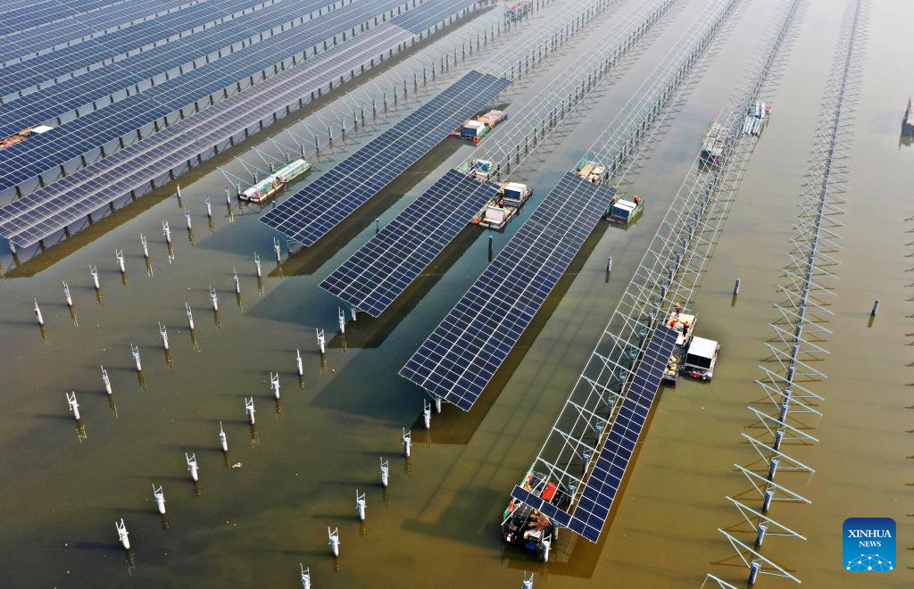 This aerial photo taken on Jan. 5, 2023 shows the construction site of a photovoltaic (PV) power project in North China's Tianjin. People's social and economic activities gradually return to normal after China's optimization of its COVID-19 response measures. (Xinhua/Li Ran)