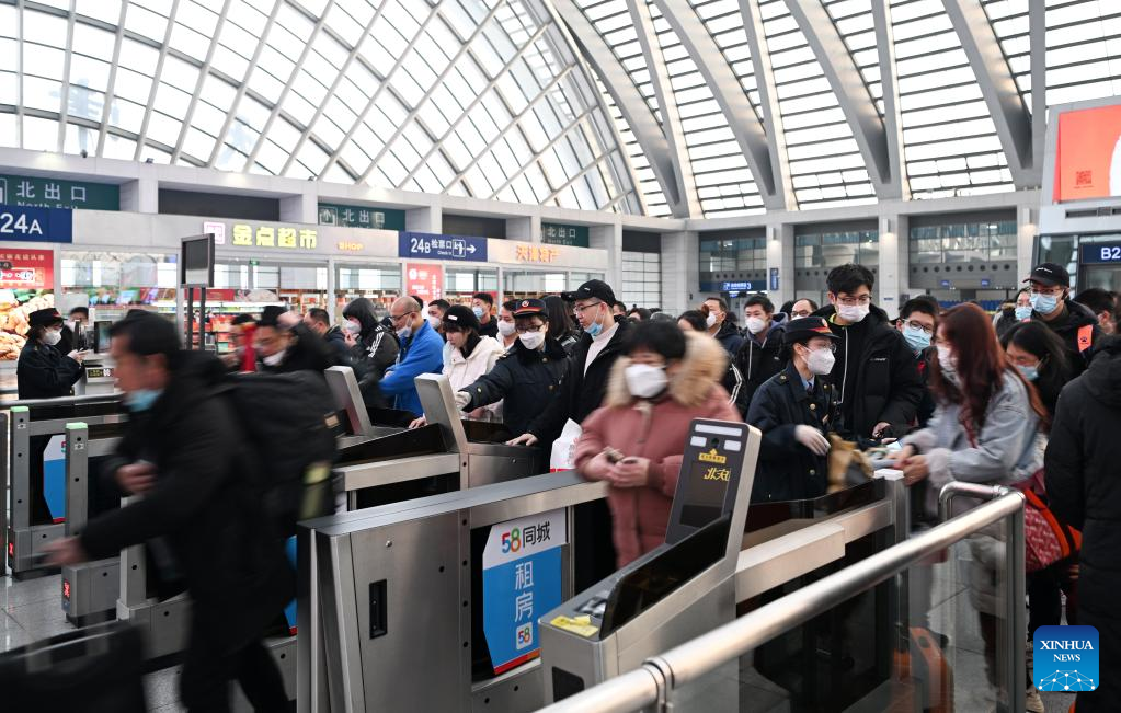 Passengers go through ticket gates at Tianjin West Railway Station in north China's Tianjin, Jan. 7, 2023. People's social and economic activities gradually return to normal after China's optimization of its COVID-19 response measures. (Xinhua/Li Ran)