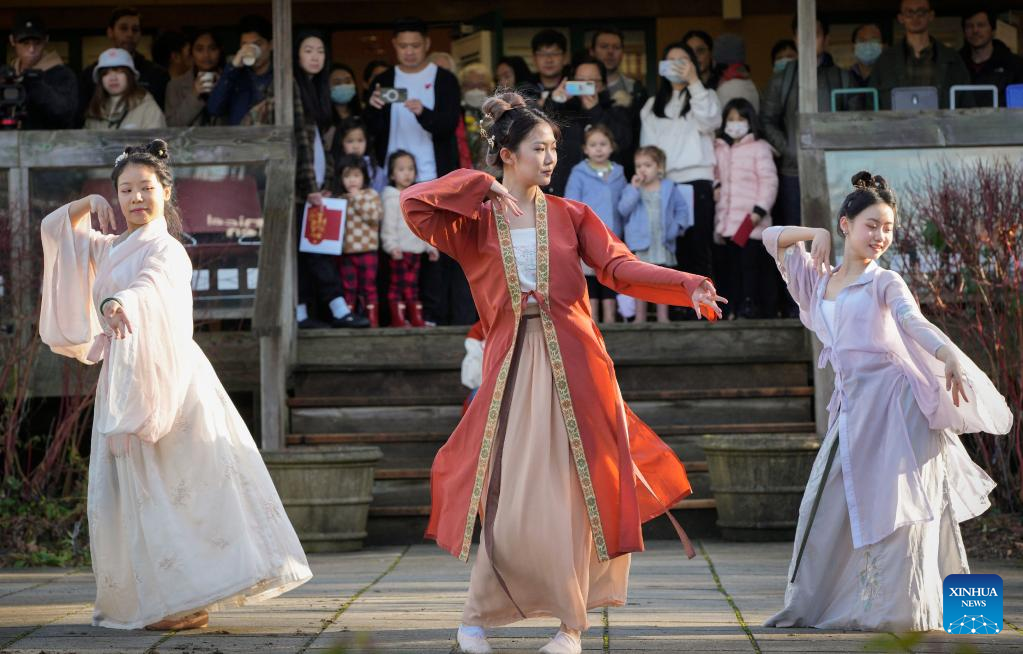 Dancers perform traditional Chinese dance at the Lunar New Year Market hosted by University of British Columbia (UBC) Botanical Garden in Vancouver, British Columbia, Canada, on Jan. 14, 2023. The festive event, hosted for the first time by UBC Botanical Garden, features artisan markets and various performances to welcome the Year of the Rabbit. (Photo by Liang Sen/Xinhua)