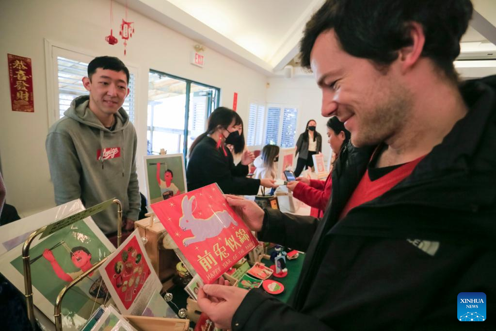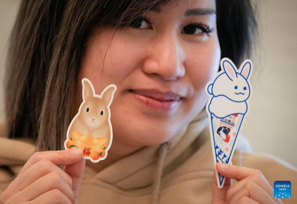 A vendor displays stickers themed on the Year of the Rabbit at the Lunar New Year Market hosted by University of British Columbia (UBC) Botanical Garden in Vancouver, British Columbia, Canada, on Jan. 14, 2023. The festive event, hosted for the first time by UBC Botanical Garden, features artisan markets and various performances to welcome the Year of the Rabbit. (Photo by Liang Sen/Xinhua)