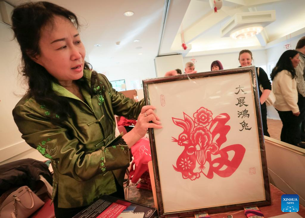 A vendor displays a paper-cut artwork themed on the Year of the Rabbit at the Lunar New Year Market hosted by University of British Columbia (UBC) Botanical Garden in Vancouver, British Columbia, Canada, on Jan. 14, 2023. The festive event, hosted for the first time by UBC Botanical Garden, features artisan markets and various performances to welcome the Year of the Rabbit. (Photo by Liang Sen/Xinhua)
