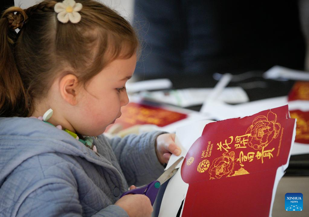 A girl learns to make a red envelope at the Lunar New Year Market hosted by University of British Columbia (UBC) Botanical Garden in Vancouver, British Columbia, Canada, on Jan. 14, 2023. The festive event, hosted for the first time by UBC Botanical Garden, features artisan markets and various performances to welcome the Year of the Rabbit. (Photo by Liang Sen/Xinhua)