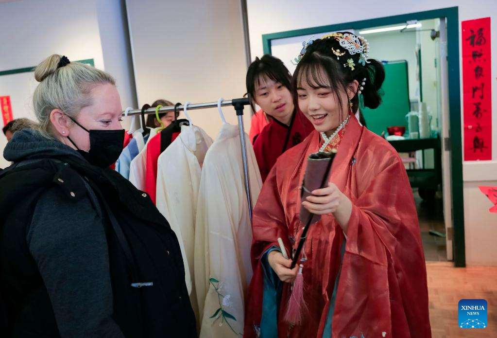 A visitor learns about the history of Hanfu, traditional Chinese clothing, at the Lunar New Year Market hosted by University of British Columbia (UBC) Botanical Garden in Vancouver, British Columbia, Canada, on Jan. 14, 2023. The festive event, hosted for the first time by UBC Botanical Garden, features artisan markets and various performances to welcome the Year of the Rabbit. (Photo by Liang Sen/Xinhua)