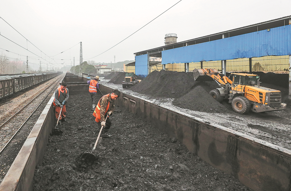 Employees shovel coal at a railway station in Pingxiang, Jiangxi province. LI GUIDONG/FOR CHINA DAILY