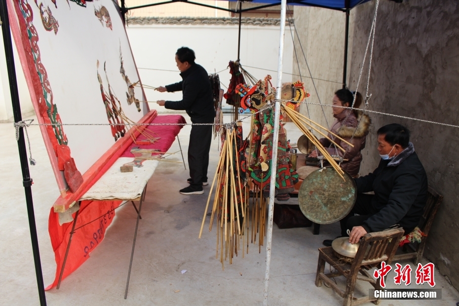 Fang Dechun, an inheritor of the intangible cultural heritage item of shadow puppetry, giving a performance in a village in Xinyang city, central China’s Henan Province, December 15, 2022. (China News Service/Yang Jie)