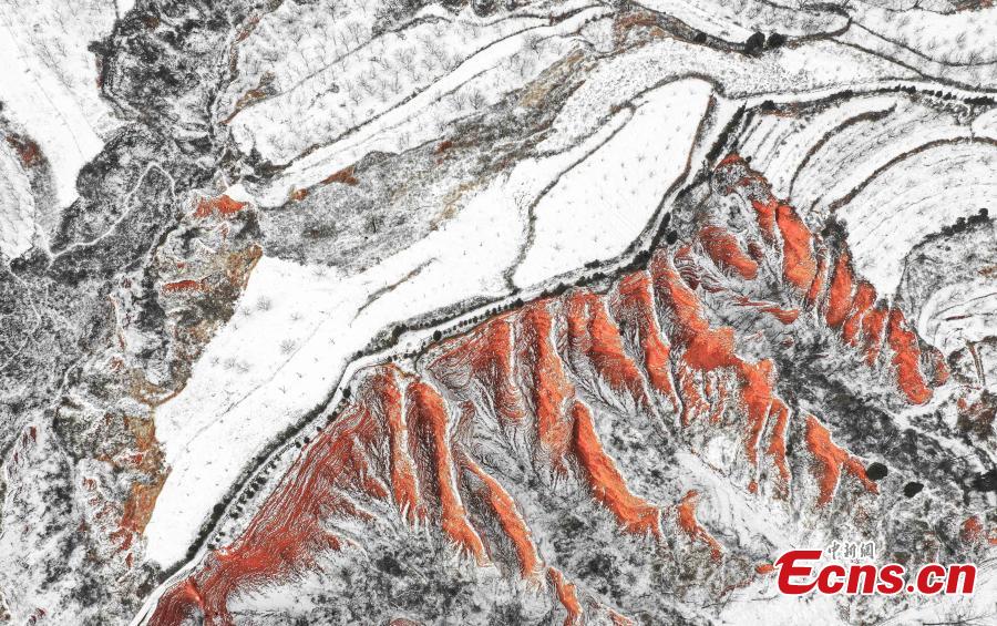 Heavy snowfall hits Hongshigu scenic area in Miaogou Village of Lushi County, central China's Henan Province, Jan. 15, 2023, adding color to its Danxia landform, characterized by reddish sandstone features. (Photo: China News Service/Niu Jinfeng)