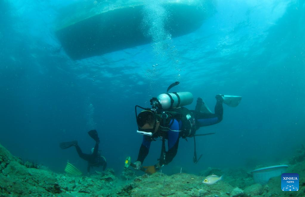 Divers transplant corals underwater in Yalong Bay, Sanya, south China's Hainan Province, Nov. 17, 2022. A coral reef ecosystem restoration project has been completed in waters of the Yalong Bay in Sanya. The work is done by means of placing artificial reefs and transplanting coral seedlings. Over 80 percent of the coral seedlings are expected to live for at least six months, while over 70 percent will survive for at least one year. (Xinhua/Yang Guanyu)