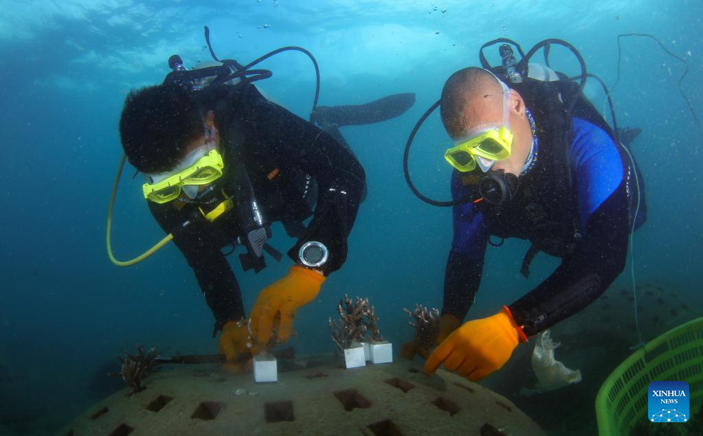 Divers transplant corals onto an artificial reef in Yalong Bay, Sanya, south China's Hainan Province, Nov. 16, 2022. A coral reef ecosystem restoration project has been completed in waters of the Yalong Bay in Sanya. The work is done by means of placing artificial reefs and transplanting coral seedlings. Over 80 percent of the coral seedlings are expected to live for at least six months, while over 70 percent will survive for at least one year. (Xinhua/Yang Guanyu)