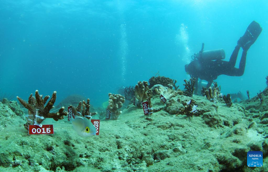 This photo taken on Nov. 17, 2022 shows transplanted corals in Yalong Bay, Sanya, south China's Hainan Province. A coral reef ecosystem restoration project has been completed in waters of the Yalong Bay in Sanya. The work is done by means of placing artificial reefs and transplanting coral seedlings. Over 80 percent of the coral seedlings are expected to live for at least six months, while over 70 percent will survive for at least one year. (Xinhua/Yang Guanyu)
