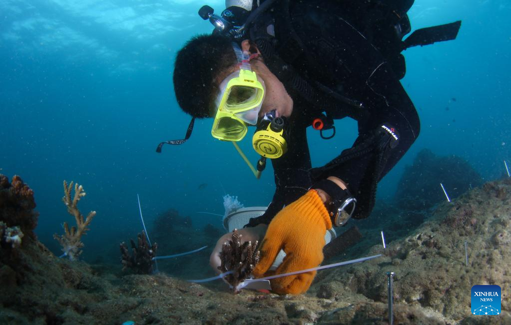 A diver transplants corals underwater in Yalong Bay, Sanya, south China's Hainan Province, Nov. 17, 2022. A coral reef ecosystem restoration project has been completed in waters of the Yalong Bay in Sanya. The work is done by means of placing artificial reefs and transplanting coral seedlings. Over 80 percent of the coral seedlings are expected to live for at least six months, while over 70 percent will survive for at least one year. (Xinhua/Yang Guanyu)