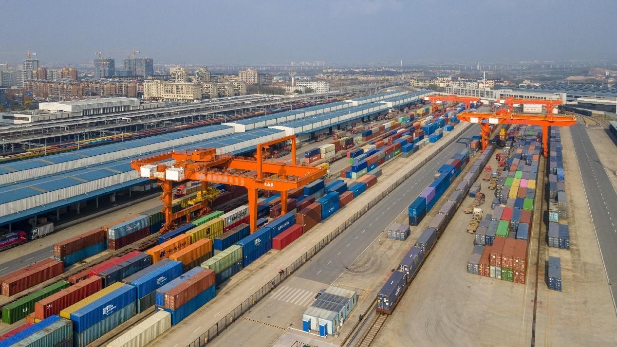 Aerial photo taken on Jan. 6, 2023 shows containers being loaded into a China-Europe freight train at a platform of the Yiwu-Xinjiang-Europe cargo line in Jinhua city, east China's Zhejiang province. (People's Daily Online/Hu Xiaofei)