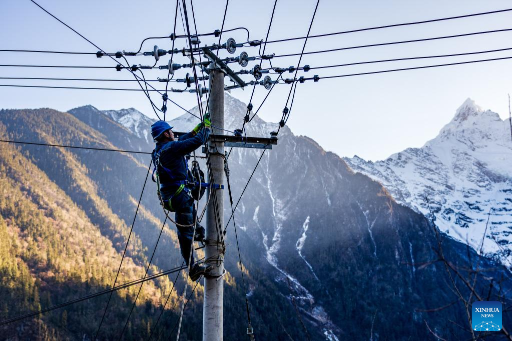 Wangden inspects power transmission lines in Yubeng Village of Deqen County, southwest China's Yunnan Province, Jan. 9, 2023.