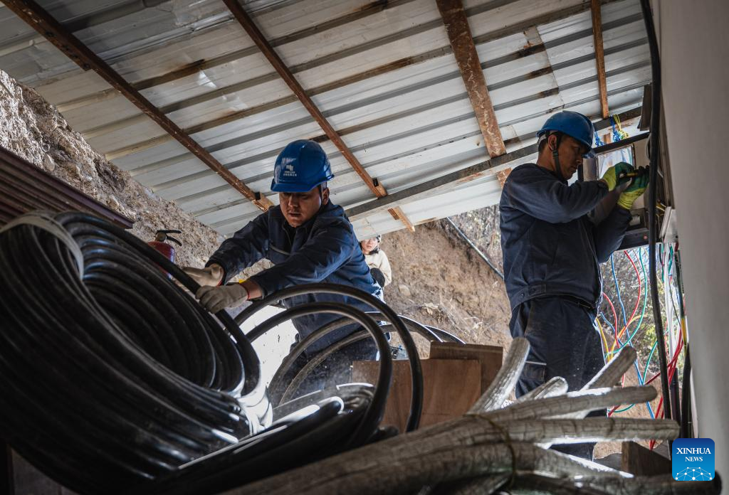 Wangden (R) inspects power lines for a hotel with his colleague Zhang Jincheng in Yubeng Village of Deqen County, southwest China's Yunnan Province, Jan. 9, 2023.
