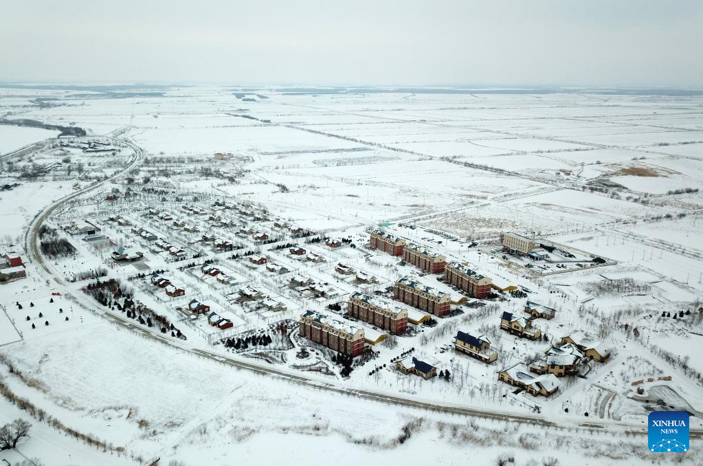 This aerial photo taken on Jan. 11, 2023 shows a view of the Hezhe ethnic village of Zhuaji in Wusu Town of Fuyuan City, northeast China's Heilongjiang Province. (Xinhua/Wang Jianwei)