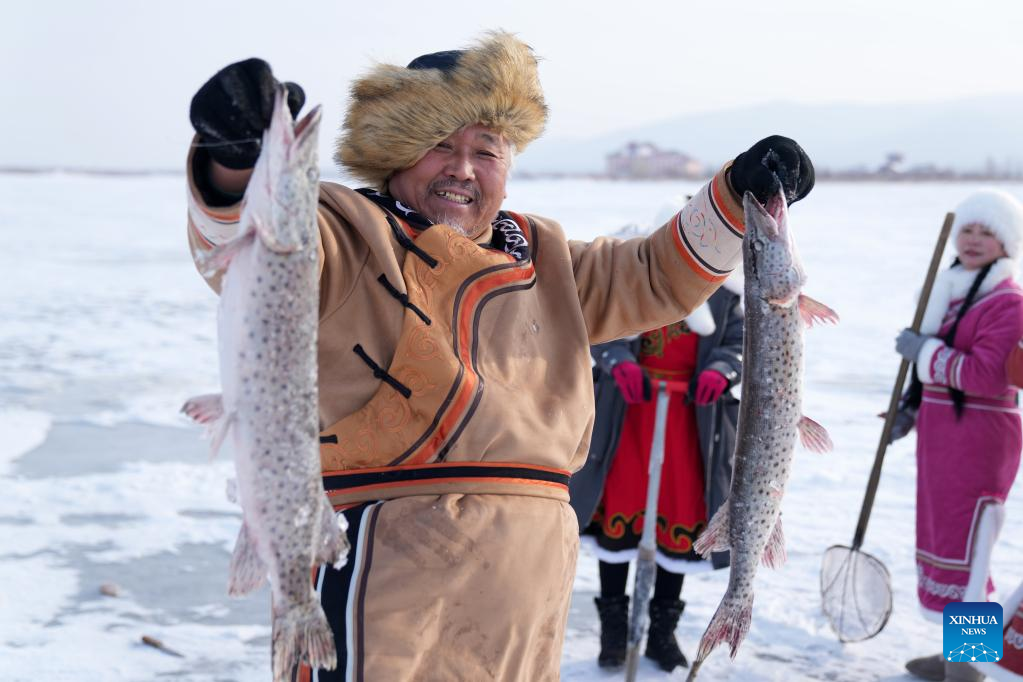 A Hezhe man shows newly caught fish on the East Lake of Fuyuan City, northeast China's Heilongjiang Province, Jan. 11, 2023. (Xinhua/Wang Jianwei)