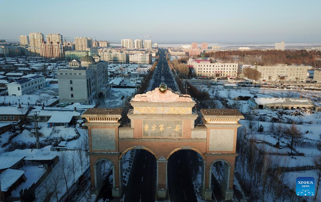 This aerial photo taken on Jan. 9, 2023 shows a view of Fuyuan City in northeast China's Heilongjiang Province. (Xinhua/Wang Jianwei)