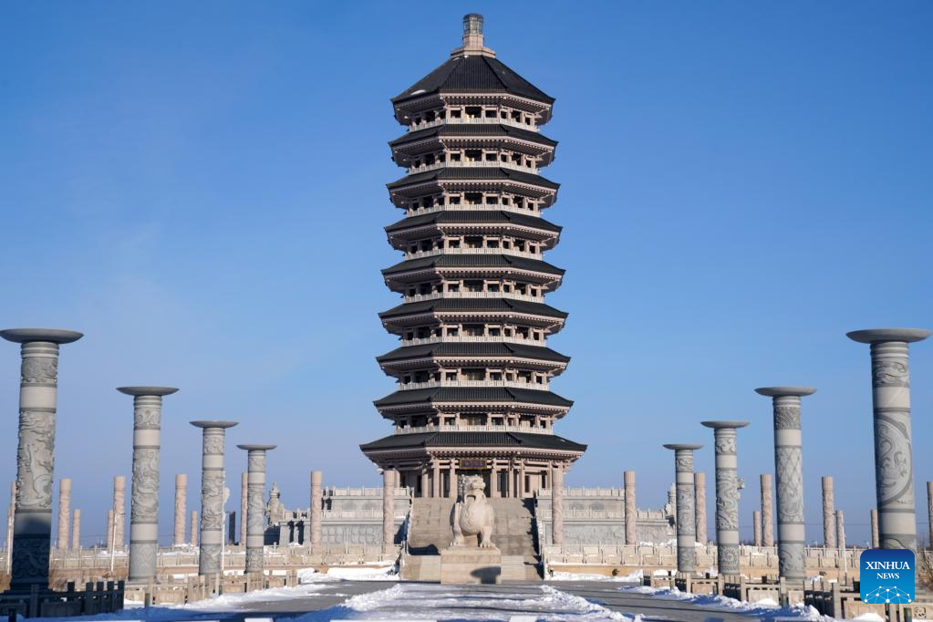 This photo taken on Jan. 10, 2023 shows Dongji pagoda in Fuyuan City, northeast China's Heilongjiang Province. (Xinhua/Wang Jianwei)