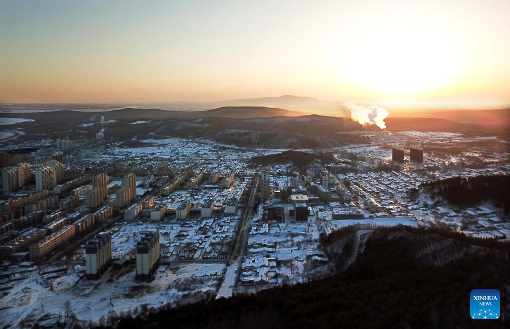 This aerial photo taken on Jan. 14, 2023 shows the city scenery in Fuyuan, northeast China's Heilongjiang Province. (Xinhua/Wang Jianwei)