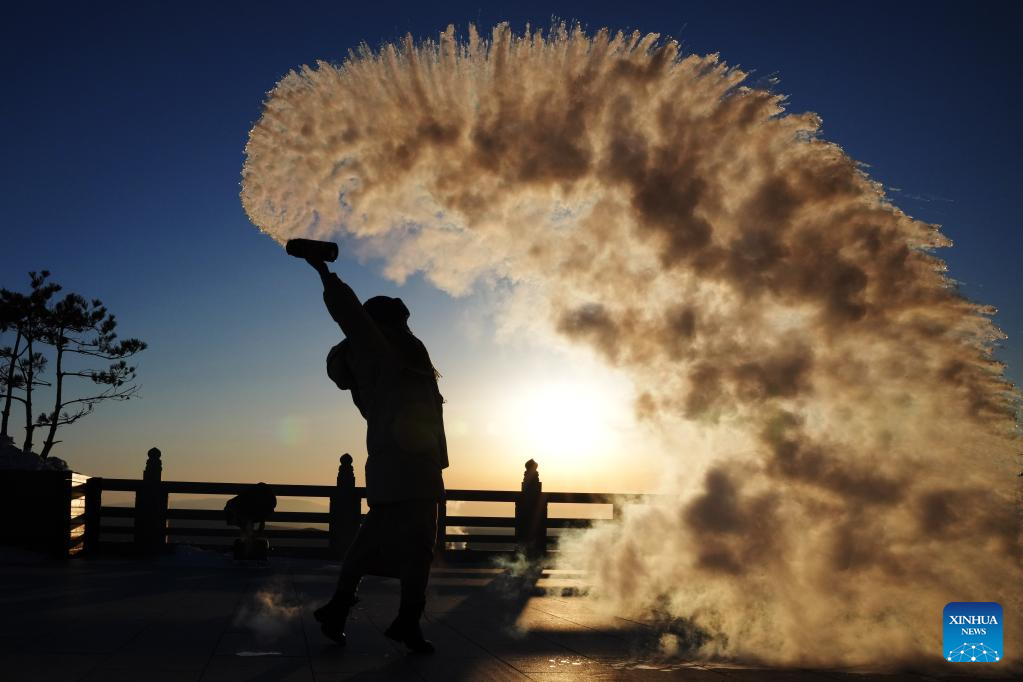 A tourist pours water in the air at sunrise in Fuyuan, northeast China's Heilongjiang Province, Jan. 14, 2023. (Xinhua/Wang Jianwei)